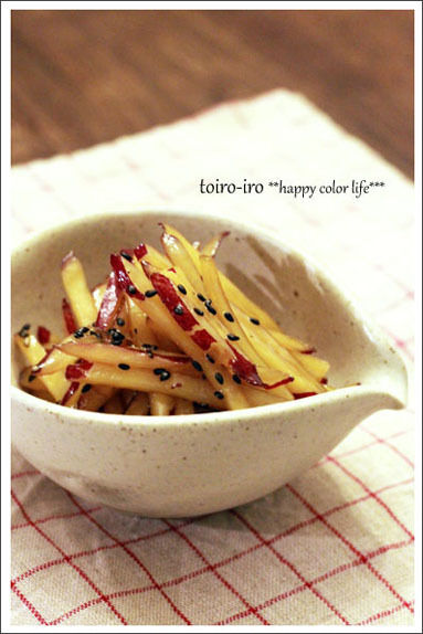 お芋のきんぴら こんばんは、トイロです明日は大きなお弁当を作らなくちゃならなくてさっきまで一人、コツコツと下準備してました~で、お弁当の隙間埋め用に、さつまいもを使ってきんぴら作りましたきんぴらと言っても、甘みを強めに、あまじょっぱい感じにしたのでお茶請けにもなるかな~ ... 2012/11/03 続きを読む
