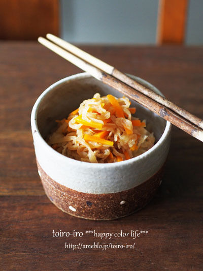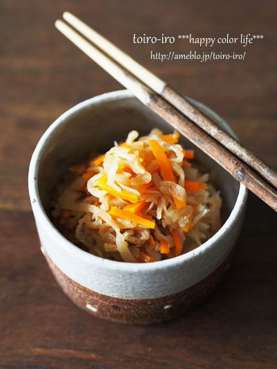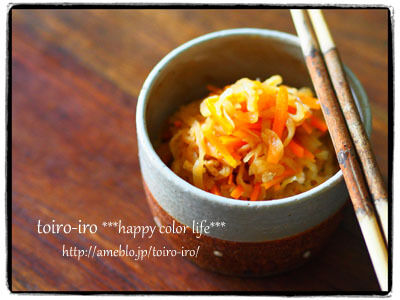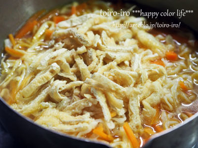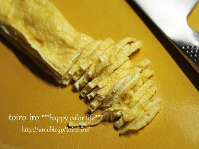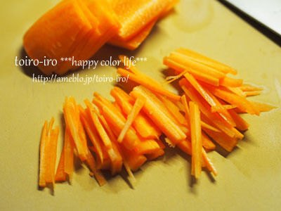 油揚げは熱湯をまわしかけて油抜きしてから水気を絞って人参と同じ長さくらいの細切りに。