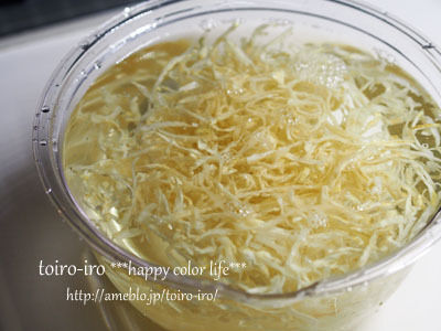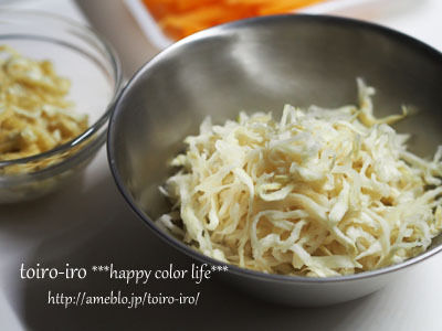 切り干し大根はざっと水洗いし、たっぷりの水で10~15分戻す。(だいたい4倍くらいの量になります)