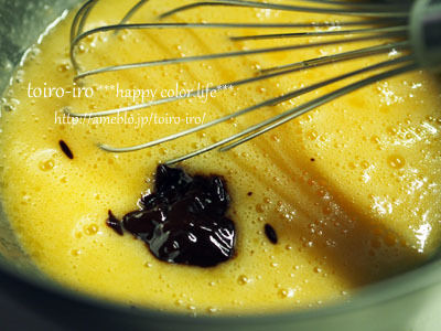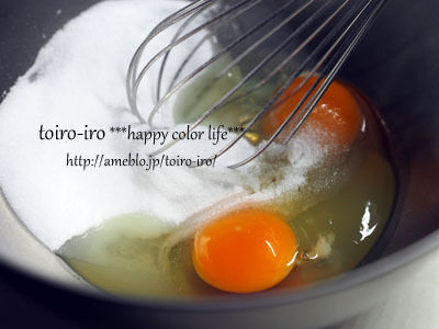 別の大きめのボウルに卵と細目グラニュー糖を入れ、ホイッパーでよく混ぜる。(泡立てる必要はありません)