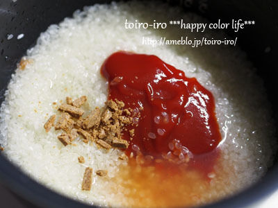 米を研ぎ、先に●の調味料を入れる。固形コンソメは細かく砕いてから加える。水を少し加えてよく混ぜておく。