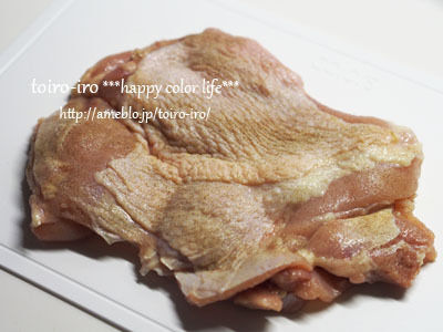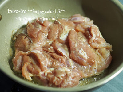 フライパンにサラダ油を入れて強火であたため、鶏肉を皮目から焼き付ける。両面、表面のみしっかり焼き色をつけて。