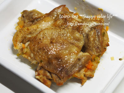 焼き色がついたら中は生焼けの状態でいいのでの上に鶏肉を乗せる。(皮を上にして)フタをして炊飯する。