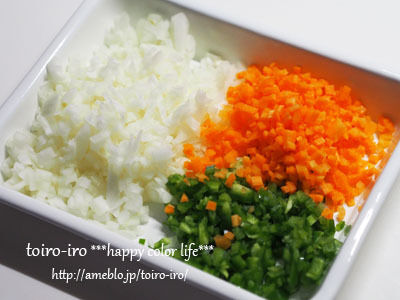 玉ねぎ、人参、ピーマンはそれぞれみじん切りにする。