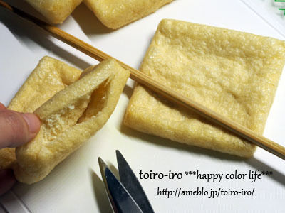 油抜きした揚げの上に菜ばしをしっかり前後に転がしてから一箇所切り込みを入れて袋状に開く。