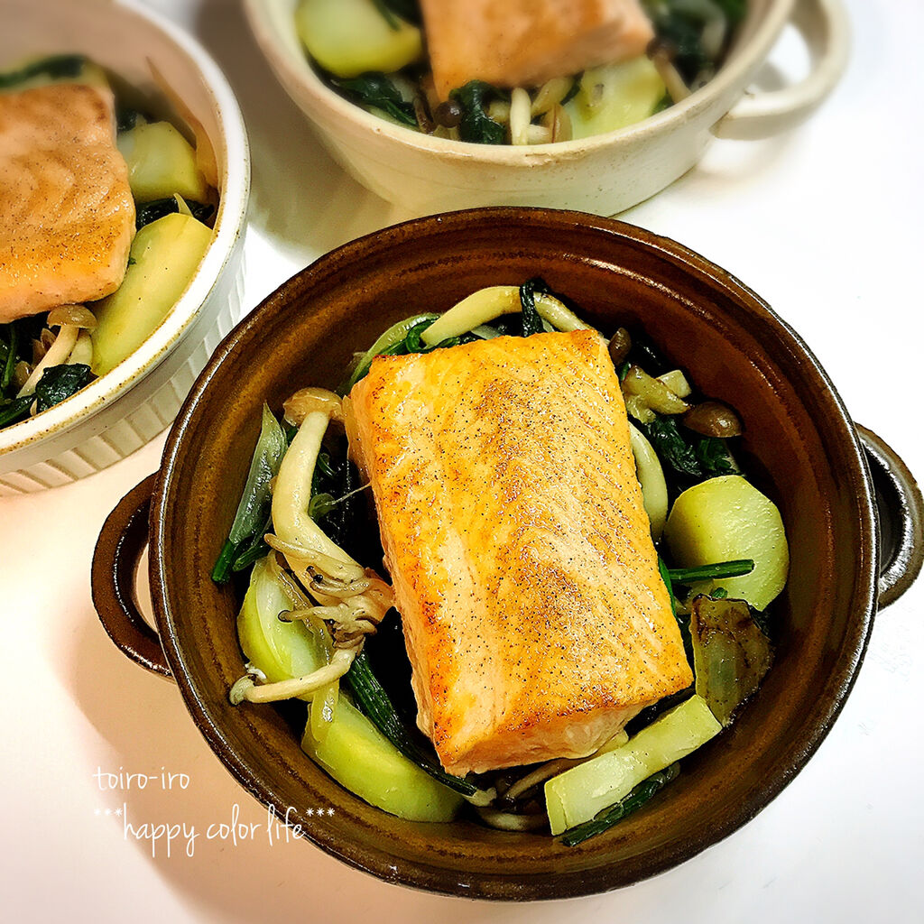 サーモンとジャガイモとほうれん草としめじ、