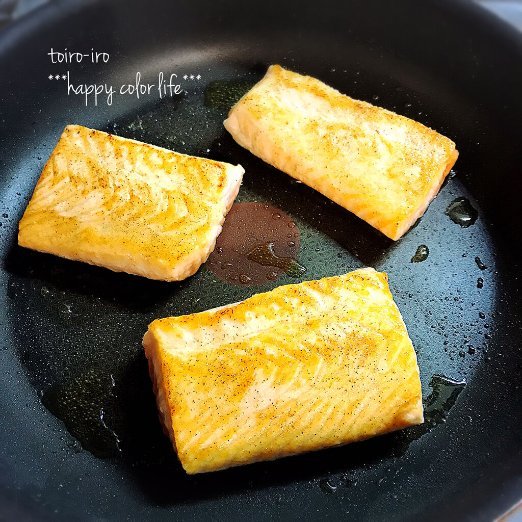 塩コショウしたサーモンをソテーします。