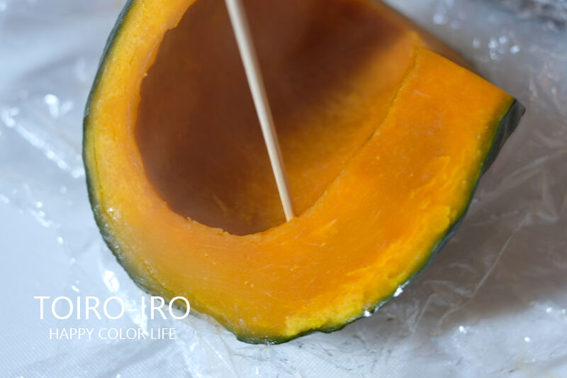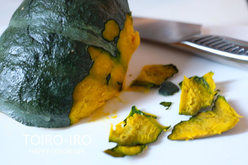 かぼちゃの皮は、加熱後に取った方が力がいらないので簡単です。(ただし火傷に注意!)