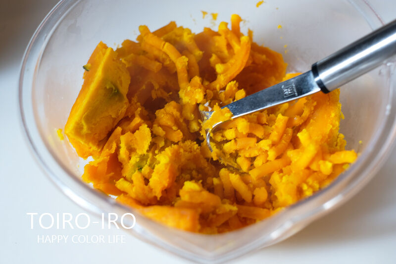 かぼちゃはマッシュします。少し形が残る程度でもいいですし、しっかりペーストにしても◎