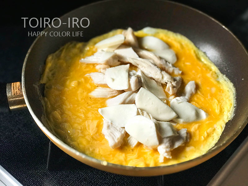 ご飯の代わりに、ササミの酒蒸しとモッツァレラチーズを入れたオムレツに。