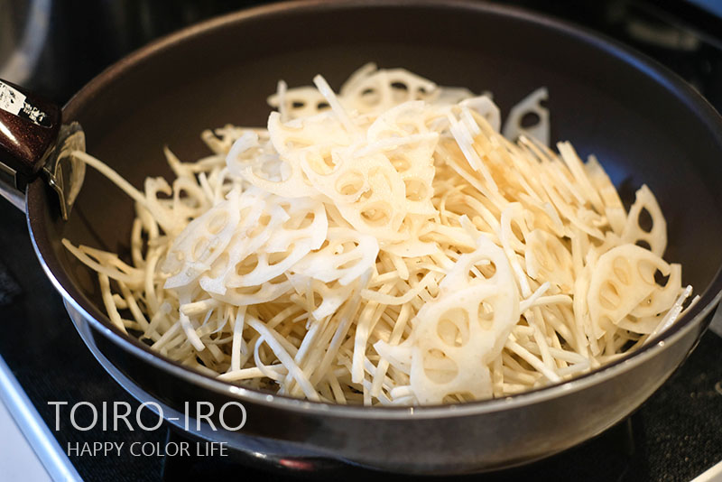 レンコンもあったのでスライサーで薄切りにしてから加えました。