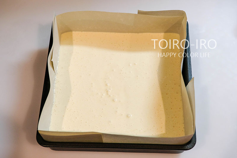 スクエア型がなくても牛乳パックの空き容器にシートを敷きこんで型がわりにする方法でも焼けるようですよ^^