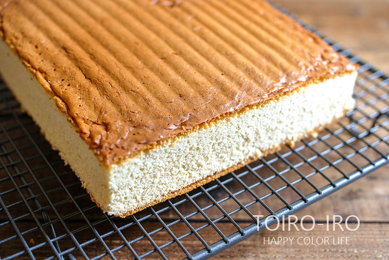 翌日、側面を切り落として(結局下の紙も剥がしたけどね。笑)ひっくり返すと、しっとりとしたカステラの出来上がり~。