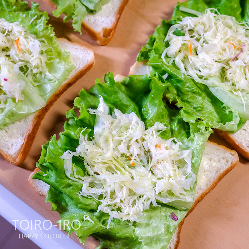 バターを塗ったパンの上にグリーンリーフを乗せて、その上にマリネしておいたキャベツを乗っけています。