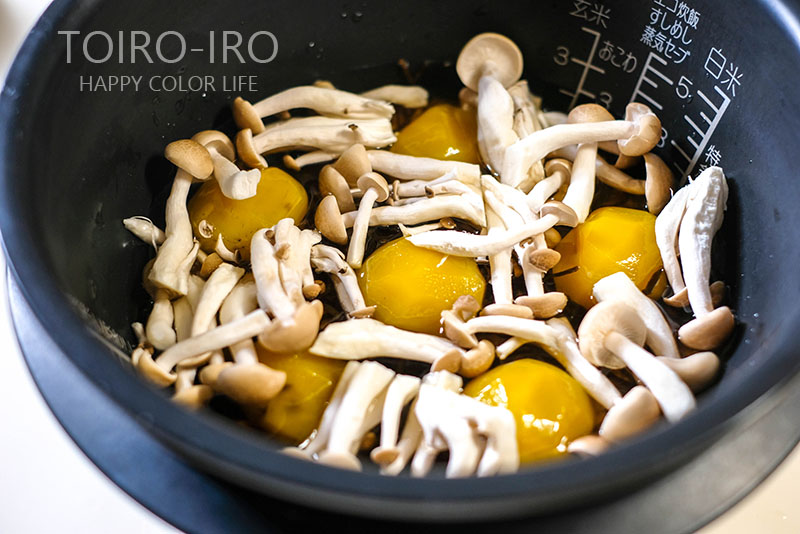 あとは塩昆布、しめじ、栗の旨味で美味しいおこわができちゃいます。