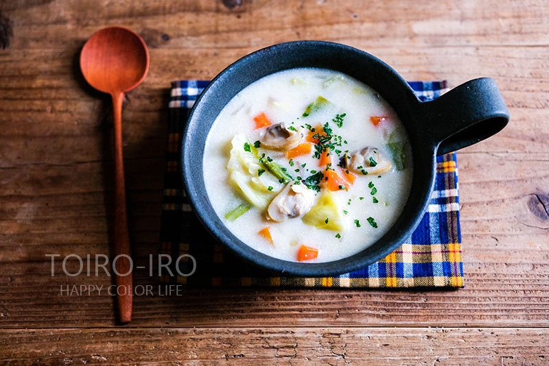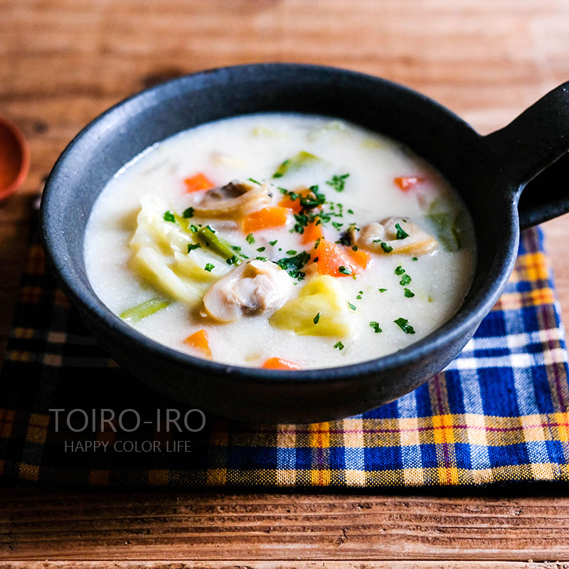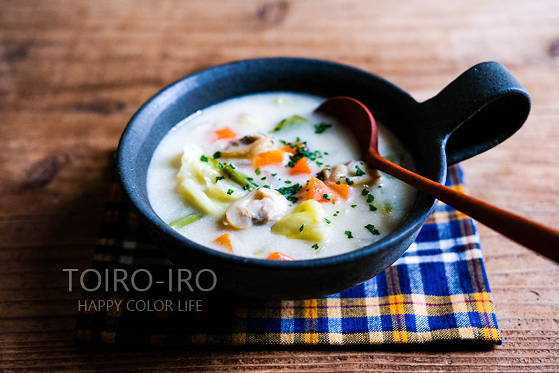 冷凍のアサリを使って、パパッと簡単にクラムチャウダーを作りました。