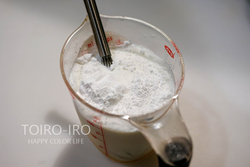 牛乳200mlに米粉パウダーを大さじ1~2ほど加えてよく混ぜ合わせておきます。