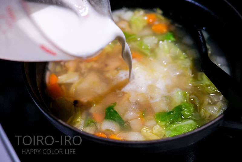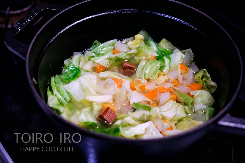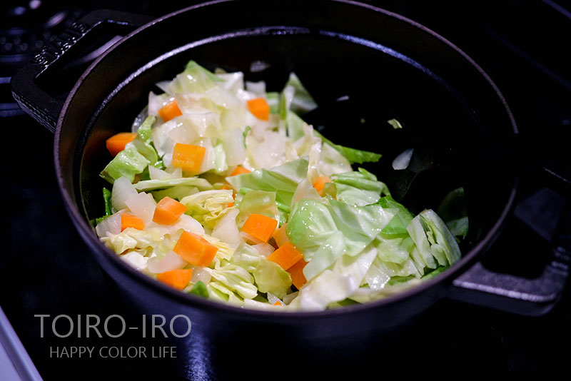 野菜は何でもいいのですが、この日は冷蔵庫にあった玉ねぎと人参とキャベツを使いました。