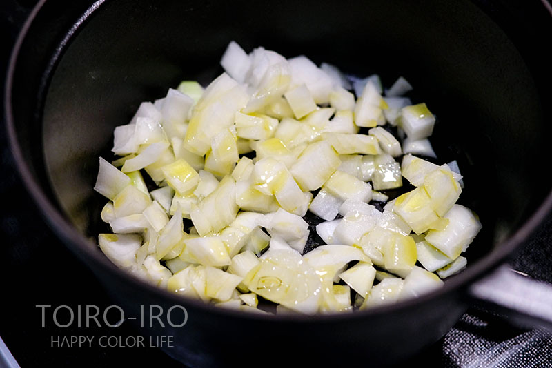 オリーブオイルを入れた鍋を中火で温めて炒めていきます。まずは玉ねぎ。