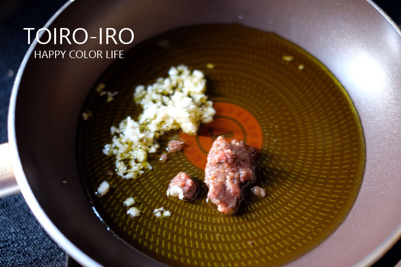 細かくたたいたアンチョビとみじん切りにしたニンニク、オリーブオイルをじっくり炒めます。