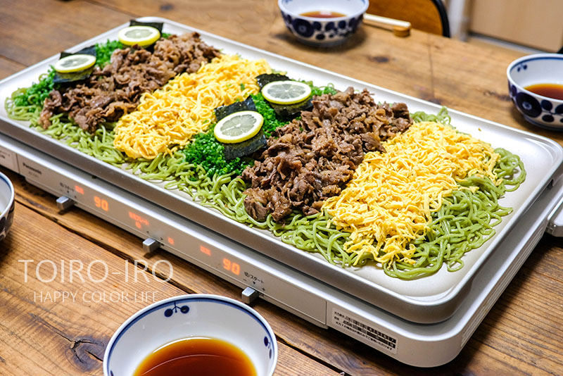 ホットプレートを250度に温めて、油を敷いて麺から焼きます!