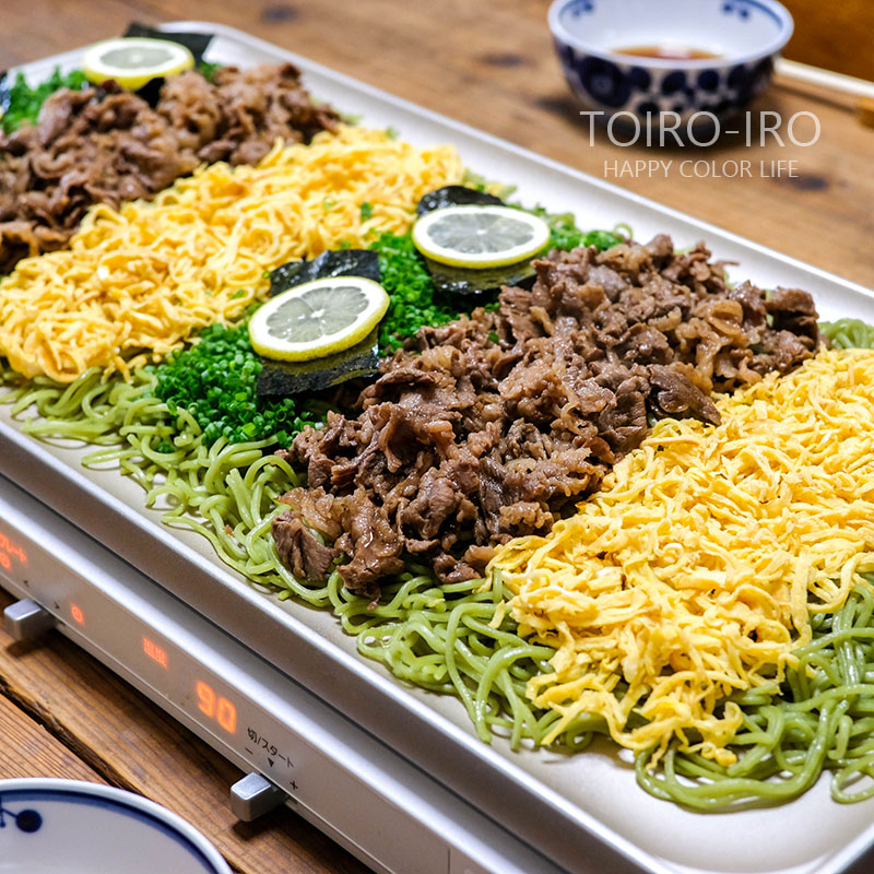 牛肉を砂糖と醤油で甘辛く味付け、甘めの錦糸卵を作って、ネギを刻んでレモンと海苔も準備!