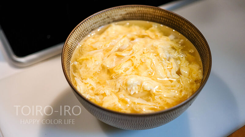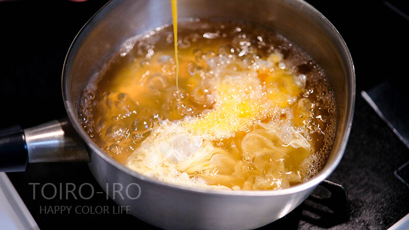 しっかりボコボコと煮たっているところに溶き卵を流し入れると