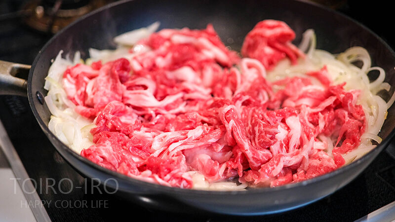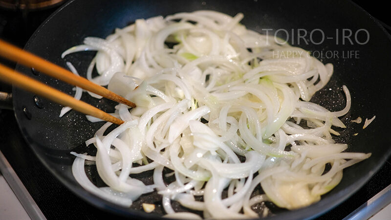 フライパンにタマネギとサラダ油を入れて炒めます。