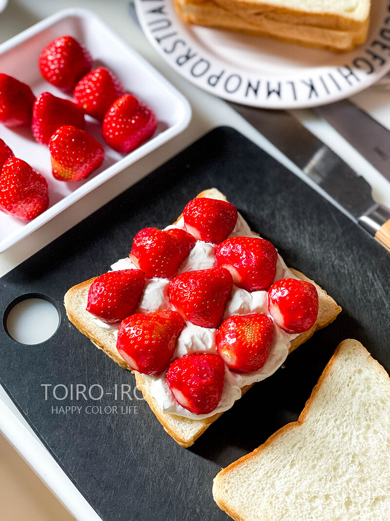 乃が美の食パンを薄めに切って、たっぷりのクリームとイチゴをサンドして
