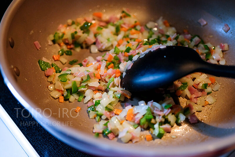 具材はタマネギ、ベーコン、人参、ピーマン。