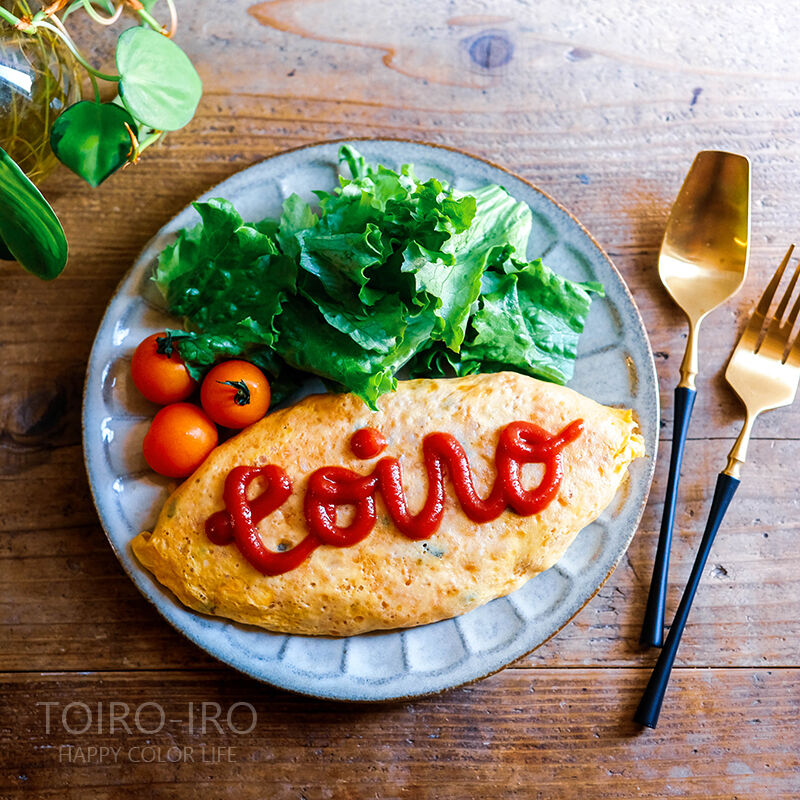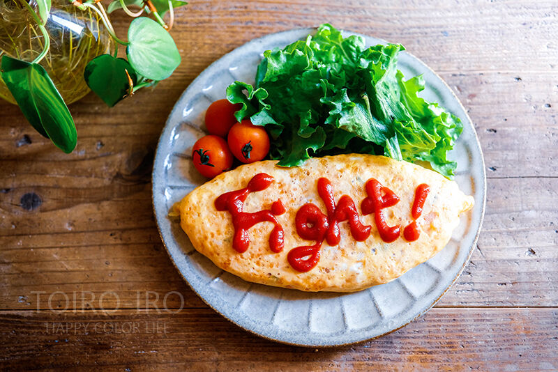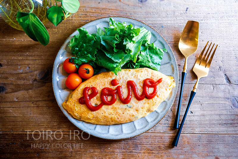 ヘラや手で形を整えてから、サラダを盛り付けたり、ケチャップをかけたりすれば出来上がり~。