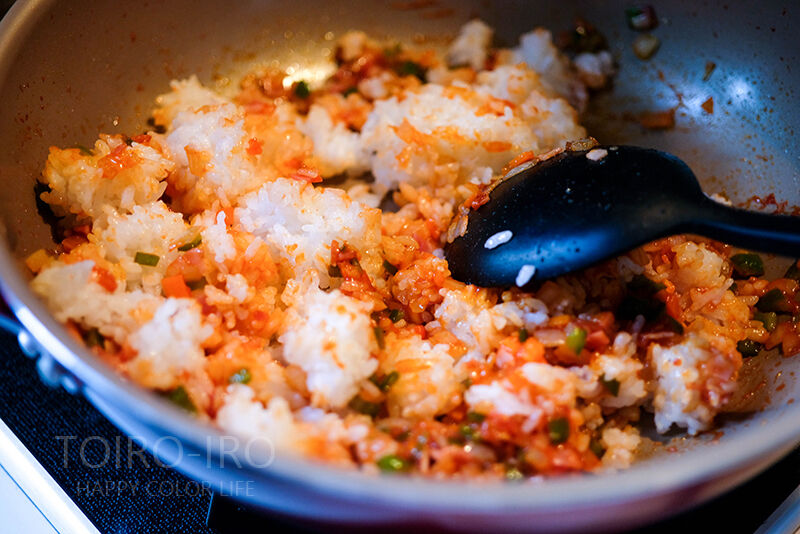 ご飯を加える前にケチャップを加えるってのがポイント!(べちゃべちゃケチャップライスにならないよ)