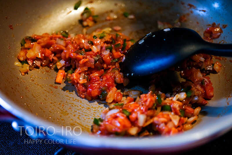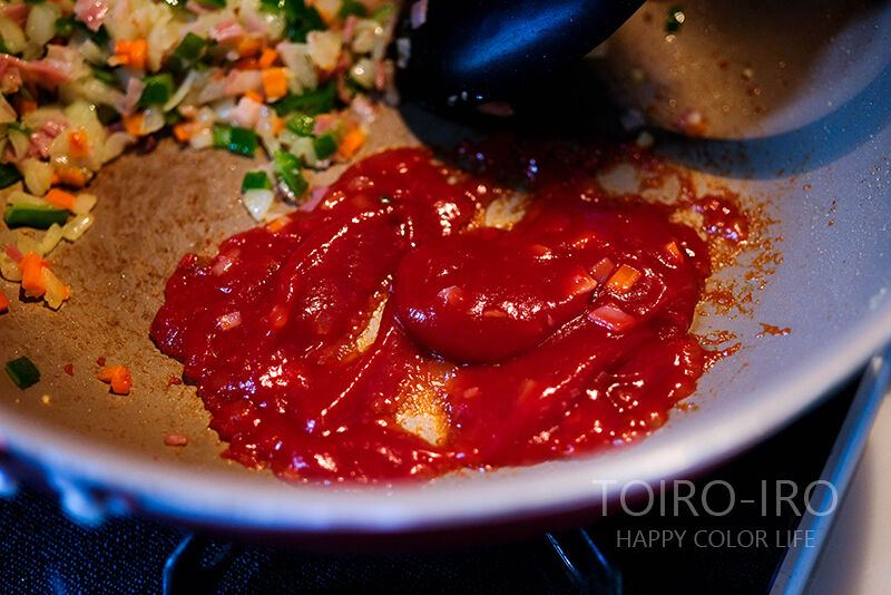 ここで、ケチャップを少し煮詰めて余分な酸味を飛ばします。(跳ねるから注意!)