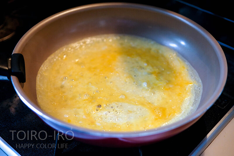 しっかり温めたフライパンに溶き卵を入れないときれいに剥がれにくくなるから注意!