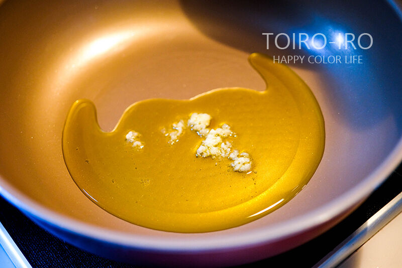 フライパンに多めのオリーブオイルと、ニンニクのみじん切りを入れて中火にかけて