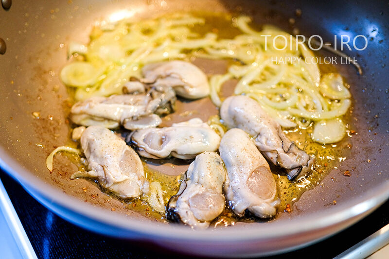 タマネギがしんなりとして透き通ってきたら、牡蠣を入れて両面焼き付けます。(あまり牡蠣は触らずに焼く感じ)