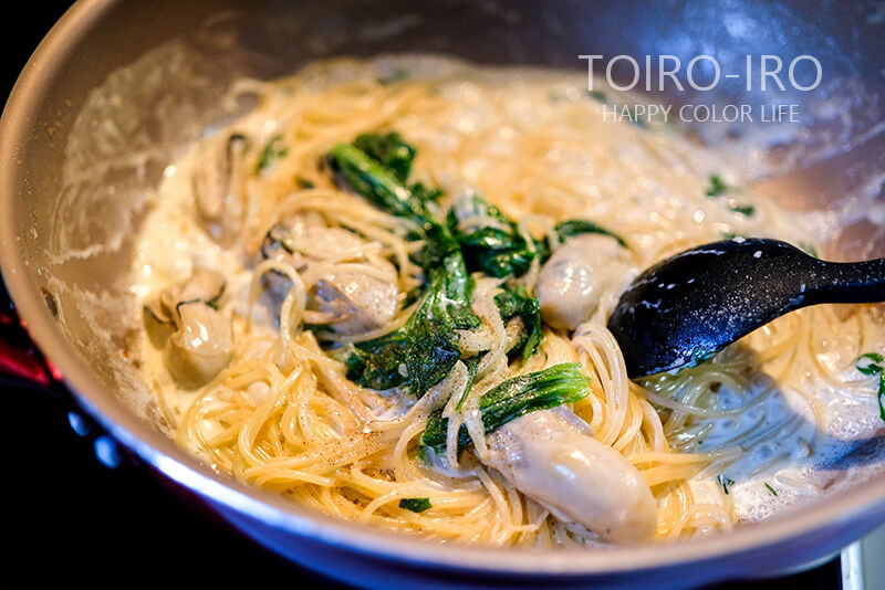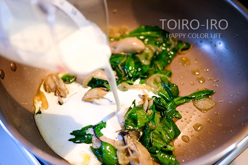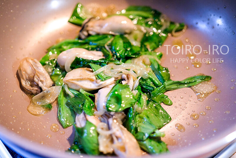 それだけではなく、すぐに火が通るのと、下ゆでなどもいらないこと、香りがよくて牡蠣との相性もいい!(個人的感想)
