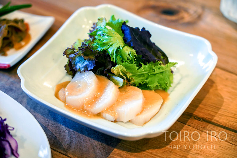 お刺身用のホタテをスライスして、ベビーリーフとともに盛り付け。