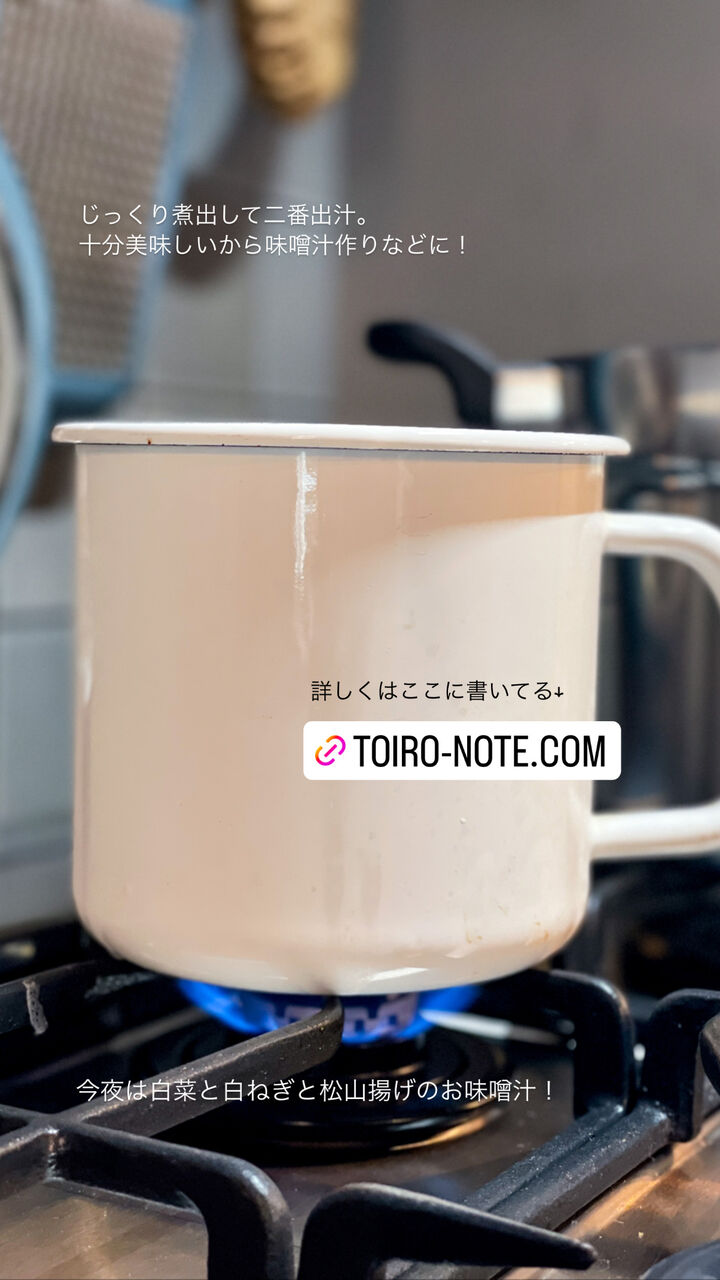 残った煮干しと昆布は、再び水を入れて煮出せば、まだまだ美味しい2番出汁が取れます!
