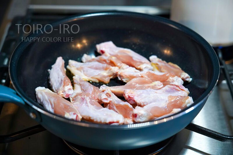 まずは、フライパンにごま油を入れてチキンバーを皮目を下にしてこんがりと焼き付けます。