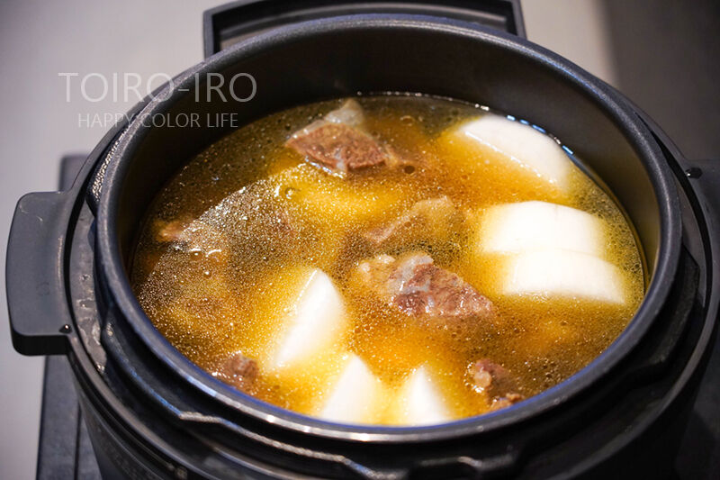 加圧後、いい感じに大根にも牛ホホ肉も柔らかくなって味が付いてきてる^^
