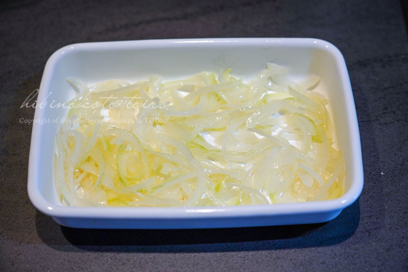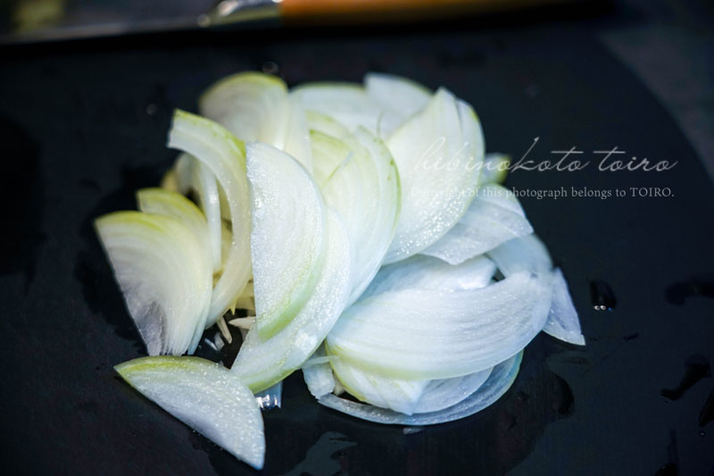 タマネギは皮を剥いて繊維に沿って薄切りにする。