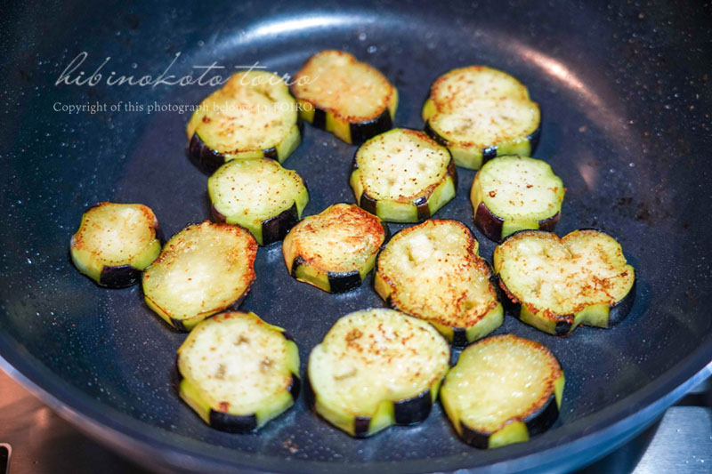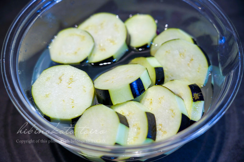 ナスはヘタを落とし、ピーラーで縞目に皮を剥いて1cmほどの厚さの輪切りにする。塩水にさらしてあく抜きするとより美味しい!(水500mlに塩小さじ1)