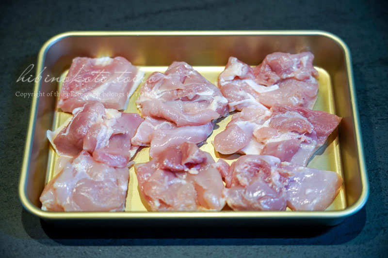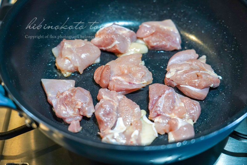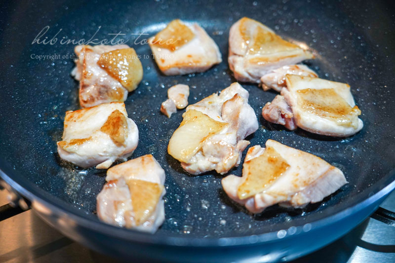 タマネギを焼いたフライパンは洗わずに、そのまま再び中火で温め鶏肉を焼く。
