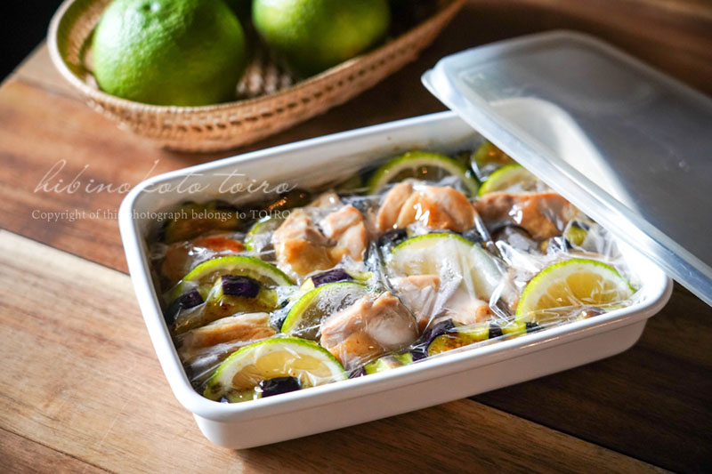 上にぴったりとラップをして(少し手で押さえて馴染ませると良い)そのまま2〜3時間つけ込むと出来上がり!(一晩でもOK!)
