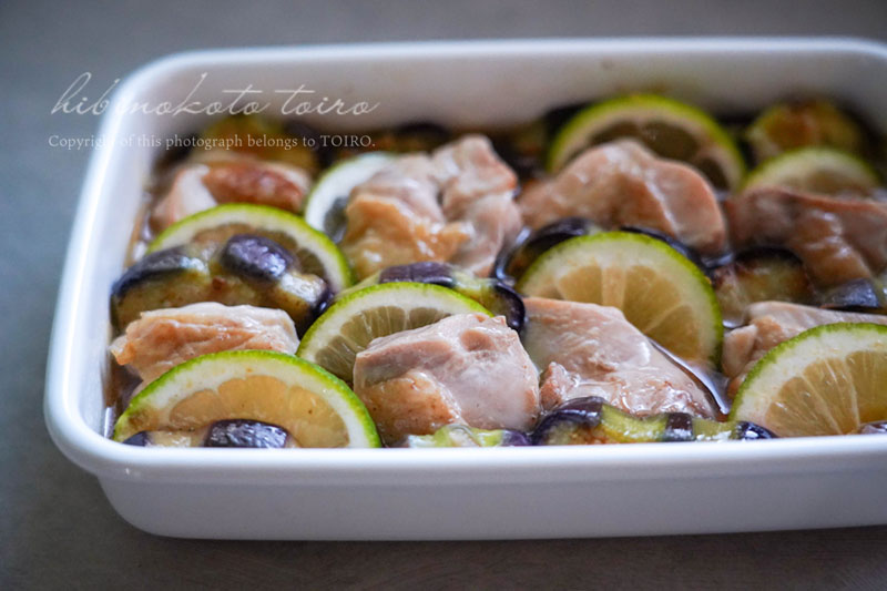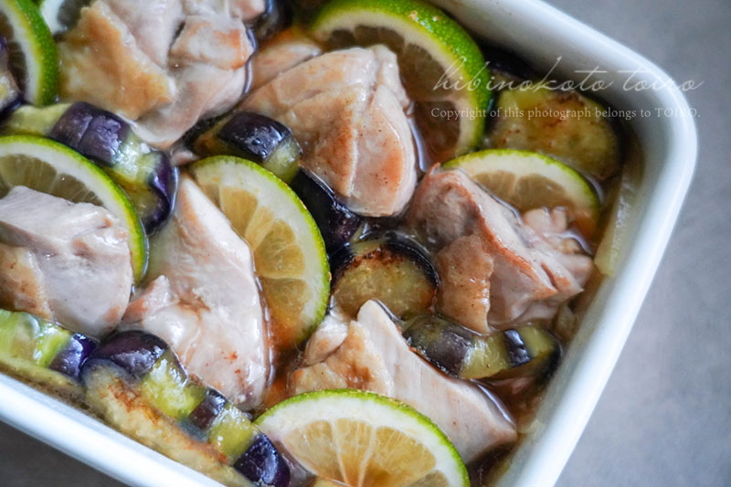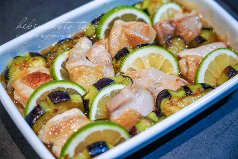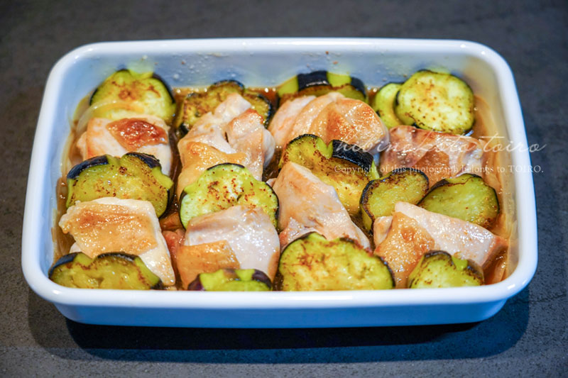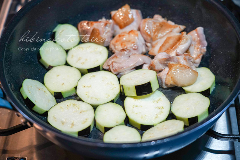 ナスに鶏肉の旨みがしみこむよう、交互に並べて