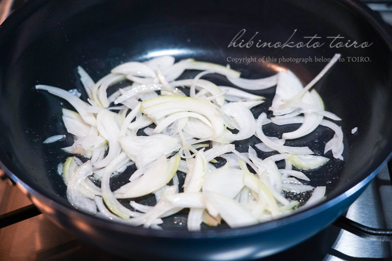 フライパンにサラダ油を入れて中火にかけ、タマネギを炒める。