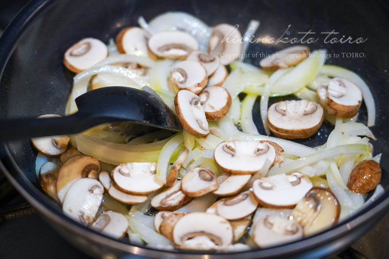 まず、フライパンにバターを入れて、タマネギスライスとマッシュルームのスライスを炒めて