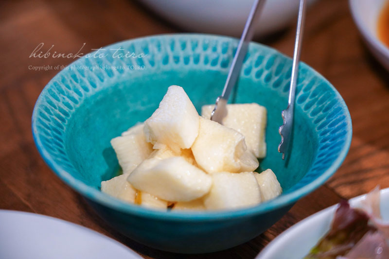 季節によって違うんですが、今の時期だとサラダ用の葉野菜・ピクルス・マリネ・漬物なんかが必ず数種類ストックしてある状態です。