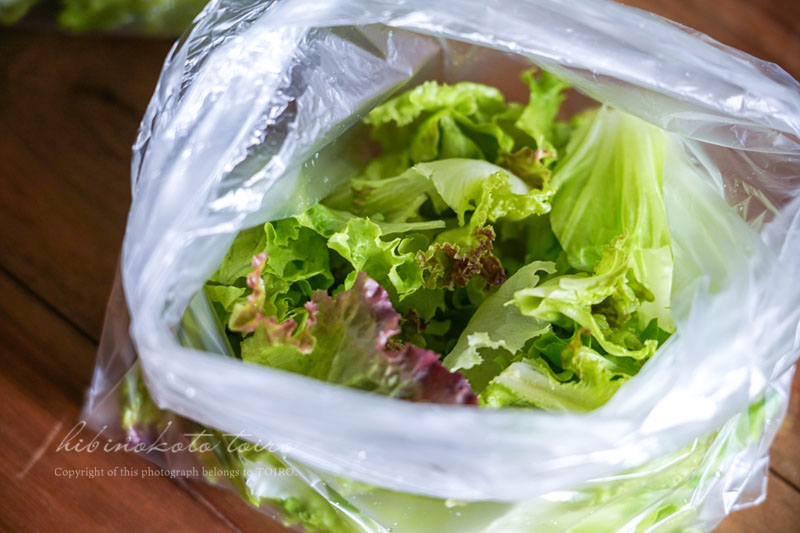 適当な大きさに切ってからシュッパを加えた水→浄水で洗って、サラダスピナーでしっかり水気を切ってからふんわりとポリ袋に入れてあります。